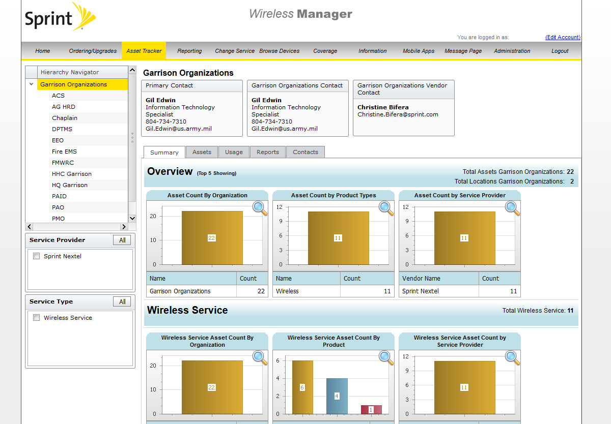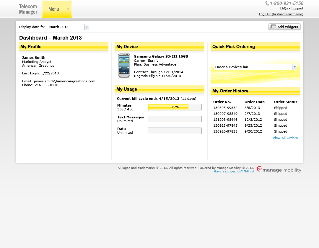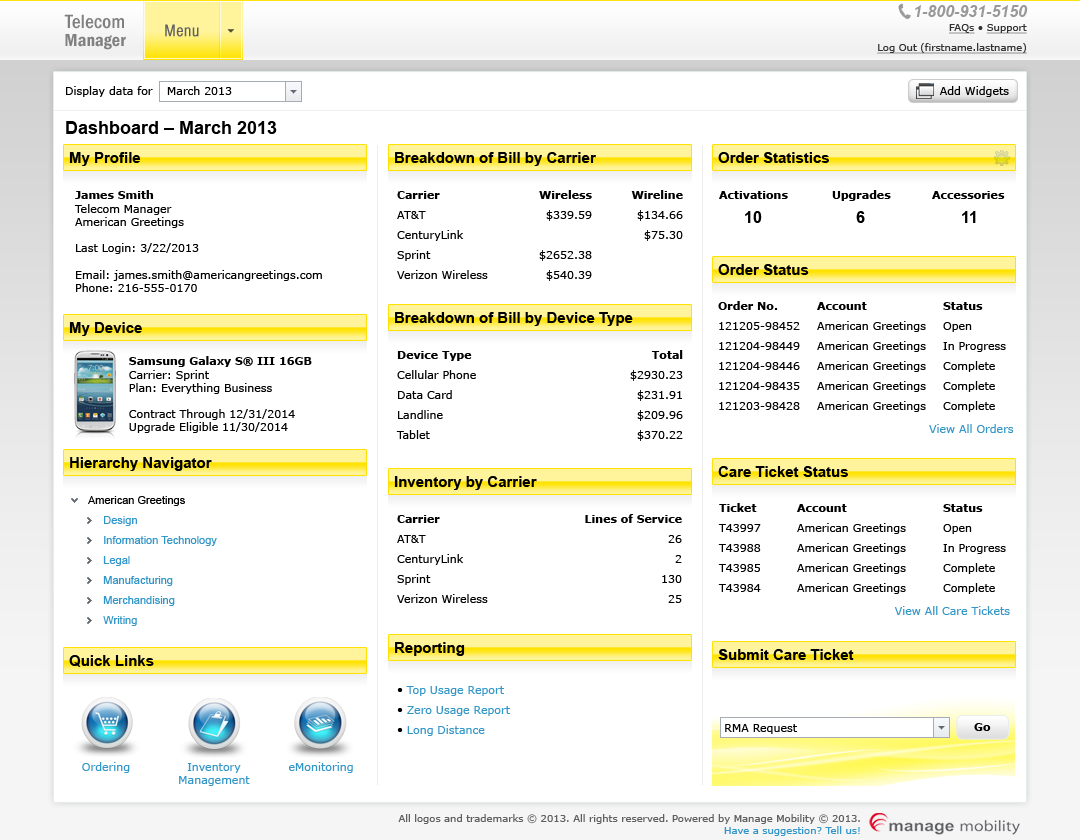 I decided to create a new user-customizable dashboard to show the logged in user the most important information pertaining to their account. The dashboard featured customizable widgets that could show account information, billing data, order statuses, device data, and more. The ability to customize the dashboard allows an account manager to create different user roles and show different widgets as applicable for a given role.